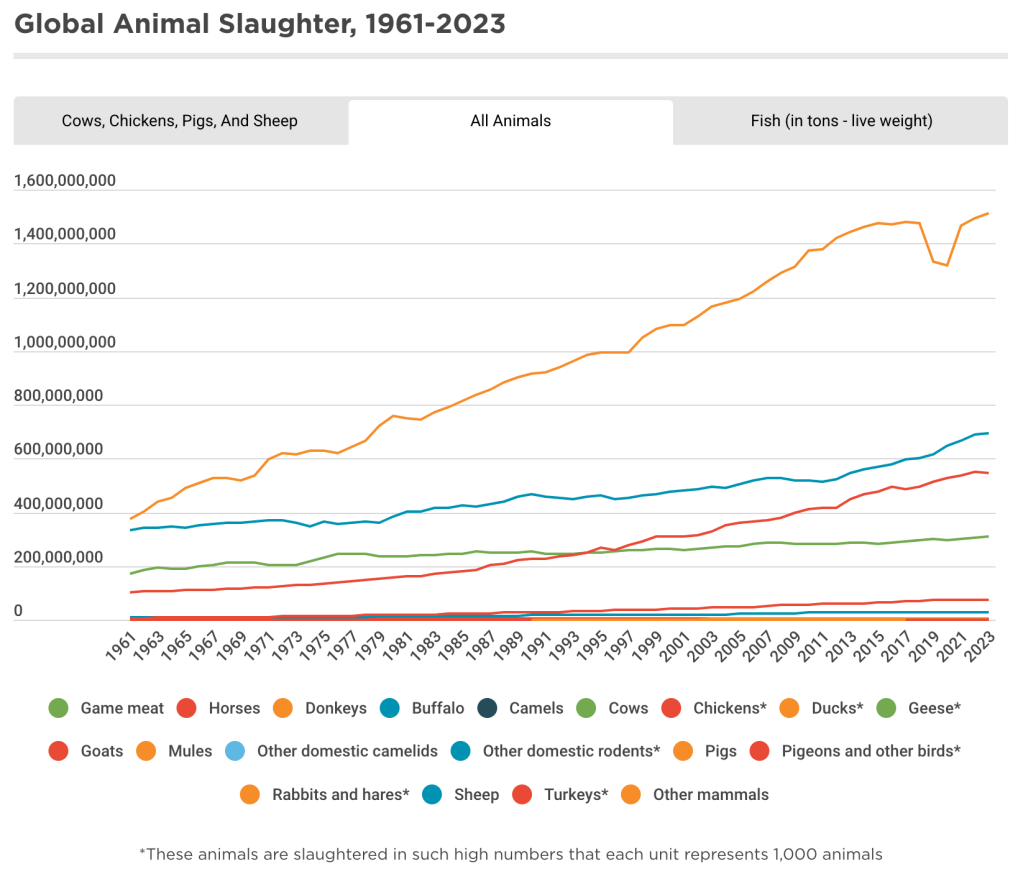 Selon les plus récentes données colligées par Faunalytics[1], le nombre annuel d’animaux terrestres tués pour la consommation s’élève désormais à 85 444 639 663 (statistiques de 2023) alors que les données de la FAO que j’utilisais affichaient 62 768 239 047 en 2010. Autrement dit, en treize ans, nous assistons à une augmentation de 36 % de victimes de l’élevage. Il faut désormais 1,7 jour pour tuer autant d’animaux terrestres qu’il y a eu de morts durant toutes les guerres de l’histoire.